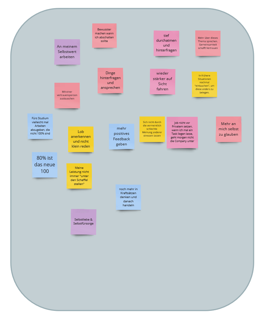 Der Workshop hat sehr gut den Nerv der Gruppe getroffen. Die Teilnehmer*innen haben sich gut abgeholt und bestärkt gefühlt und wir haben beschlossen, individuellen Leistungsdruck nun mehr auf die Agenda zu nehmen und uns gegenseitig zu unterstützen.